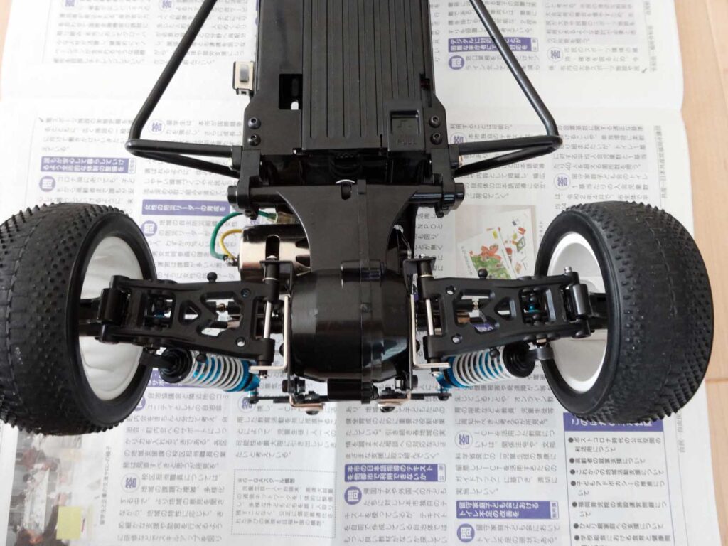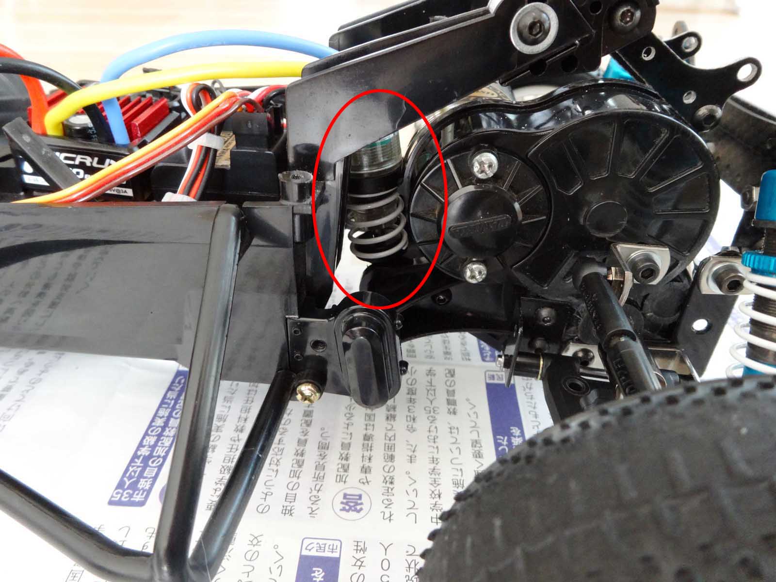 ちなみに、オイルダンパーは写真では仮でDF-03アルミダンパーを付けていますが、その後にCVAダンパーショートに変更しました。(ダンパー長85mm前後に設定)