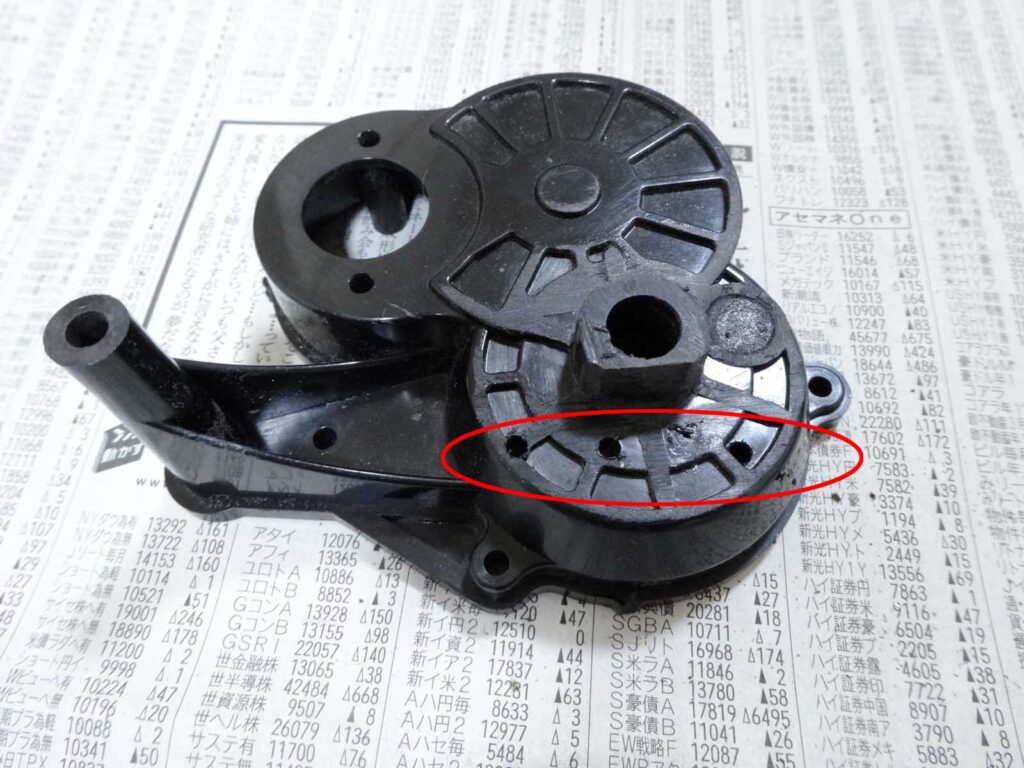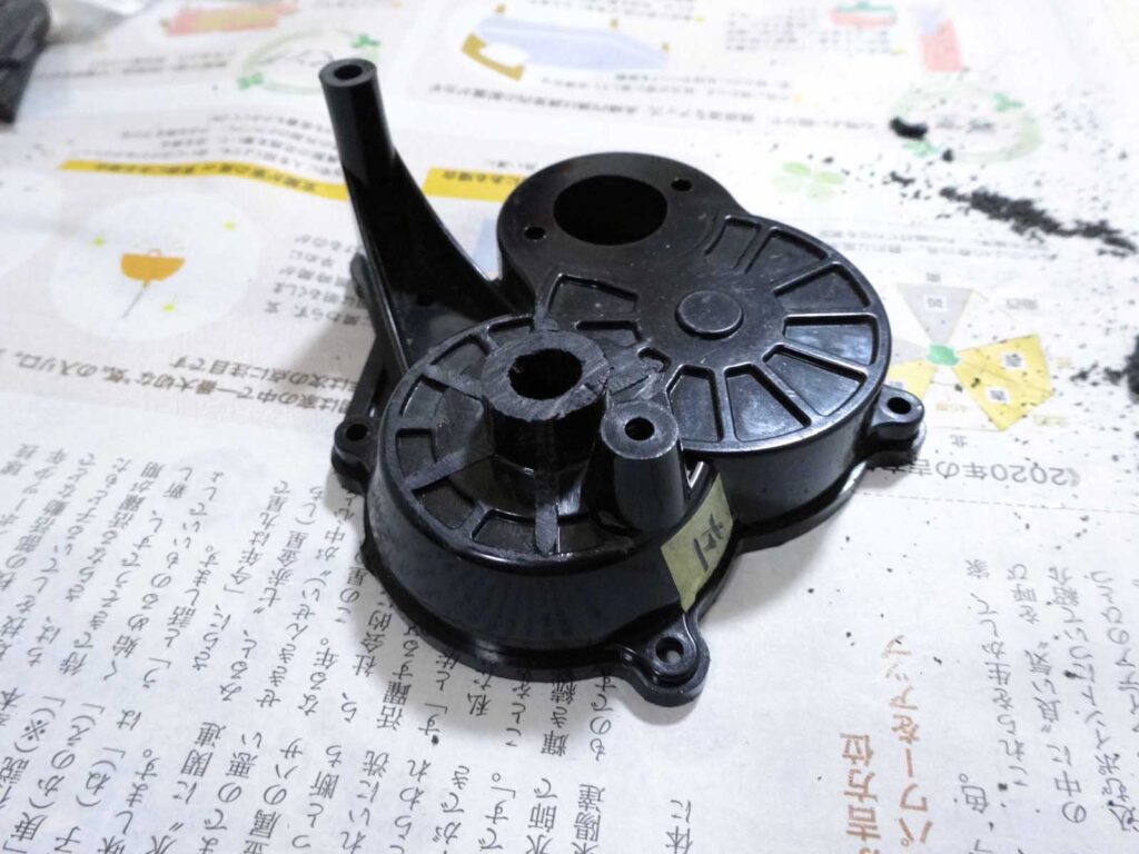 プラリペアで穴を埋める方法は、表からマスキングテープで穴を塞いでギヤボックスの内側からプラリペアを流すだけです。